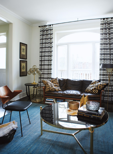 Below, the room's decor is punched up quite a bit with bold striped drapes, a vibrant blue rug, shiny brass accessories and more.