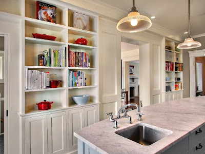 - Kitchen built in shelving for cookbook storage and other kitchen items